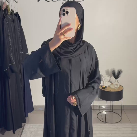 Son tissu fluide, opaque et léger permet un tombé parfait qui affine la silhouette sans effort. Le noir profond apporte une vraie prestance, rendant cette abaya idéale pour le quotidien comme pour les occasions plus habillées.