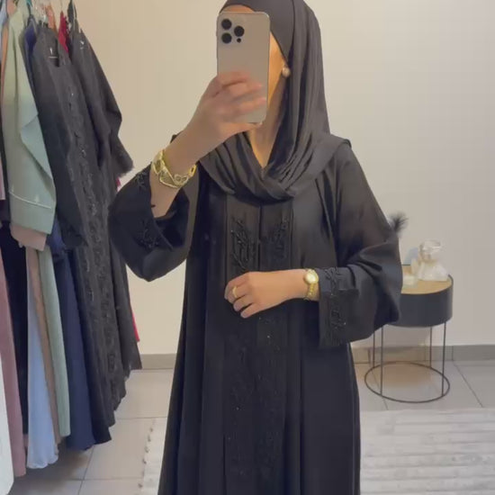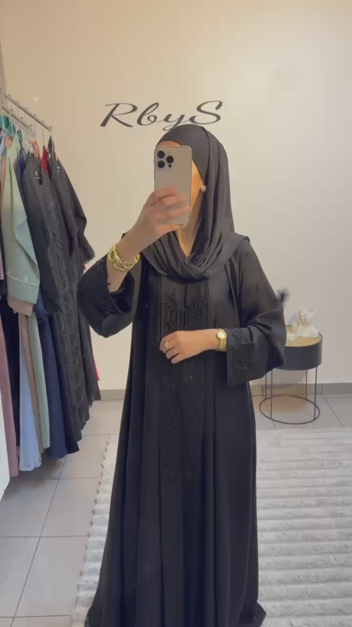 Sa teinte noir profond, chic et indémodable, en fait une abaya idéale pour les occasions spéciales comme pour le quotidien, notamment durant le mois de Ramadan. Les manches larges subtilement brodées renforcent son allure élégante et féminine, tout en conservant une grande légèreté.