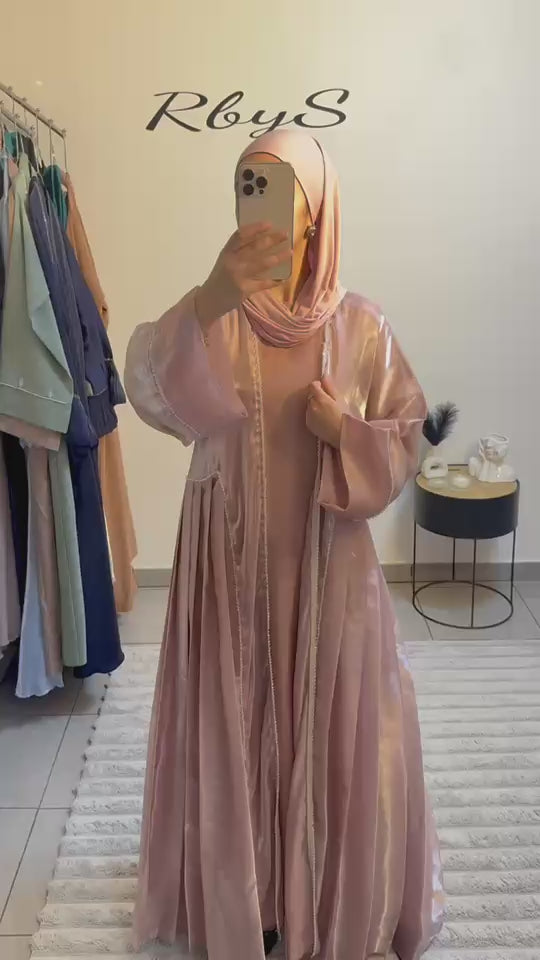 Sa teinte blush rosé, douce et lumineuse, illumine le teint et confère à cet ensemble une élégance romantique et apaisante. La pièce intérieure fluide complète harmonieusement l’ensemble pour une tenue confortable, élégante et facile à porter, aussi bien pour le quotidien que pour les occasions spéciales, notamment durant le mois de Ramadan.
